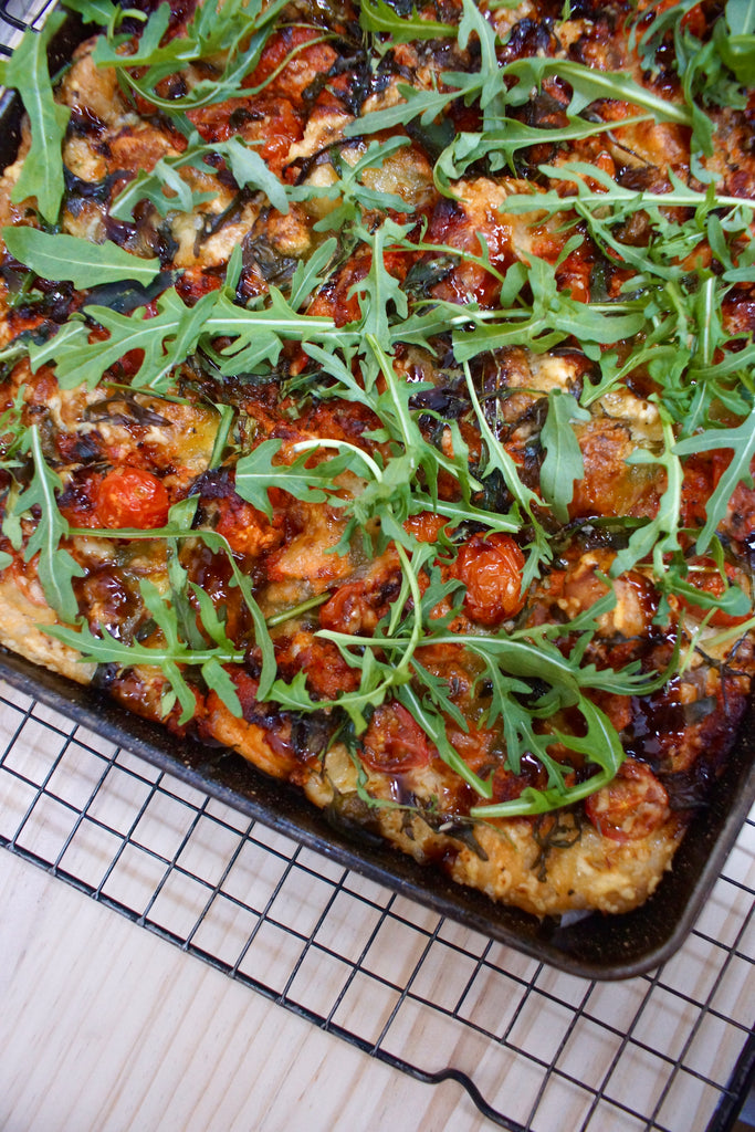 Loaded focaccia topped with a variety of delicious flavours. Each tray includes 15 loaded squares, perfect for parties, events, meetings or catering.